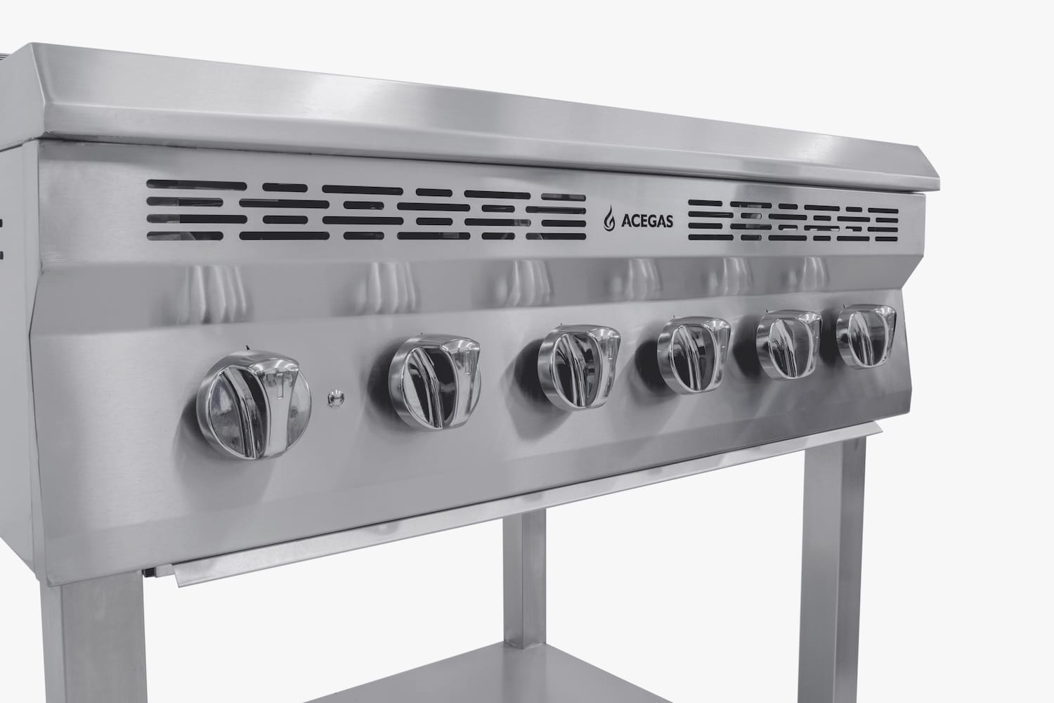 Dimensiones: 90 × 75 × 90 cmPuestos: 6Quemadores: 6 quemadores de alta potenciaPotencia (BTU/h): 150,000Cuerpo: Acero inoxidable C18/C20Parrillas y Quemadores: Hierro fundidoPeso: 70 kgFuente de energía: Gas natural/propano