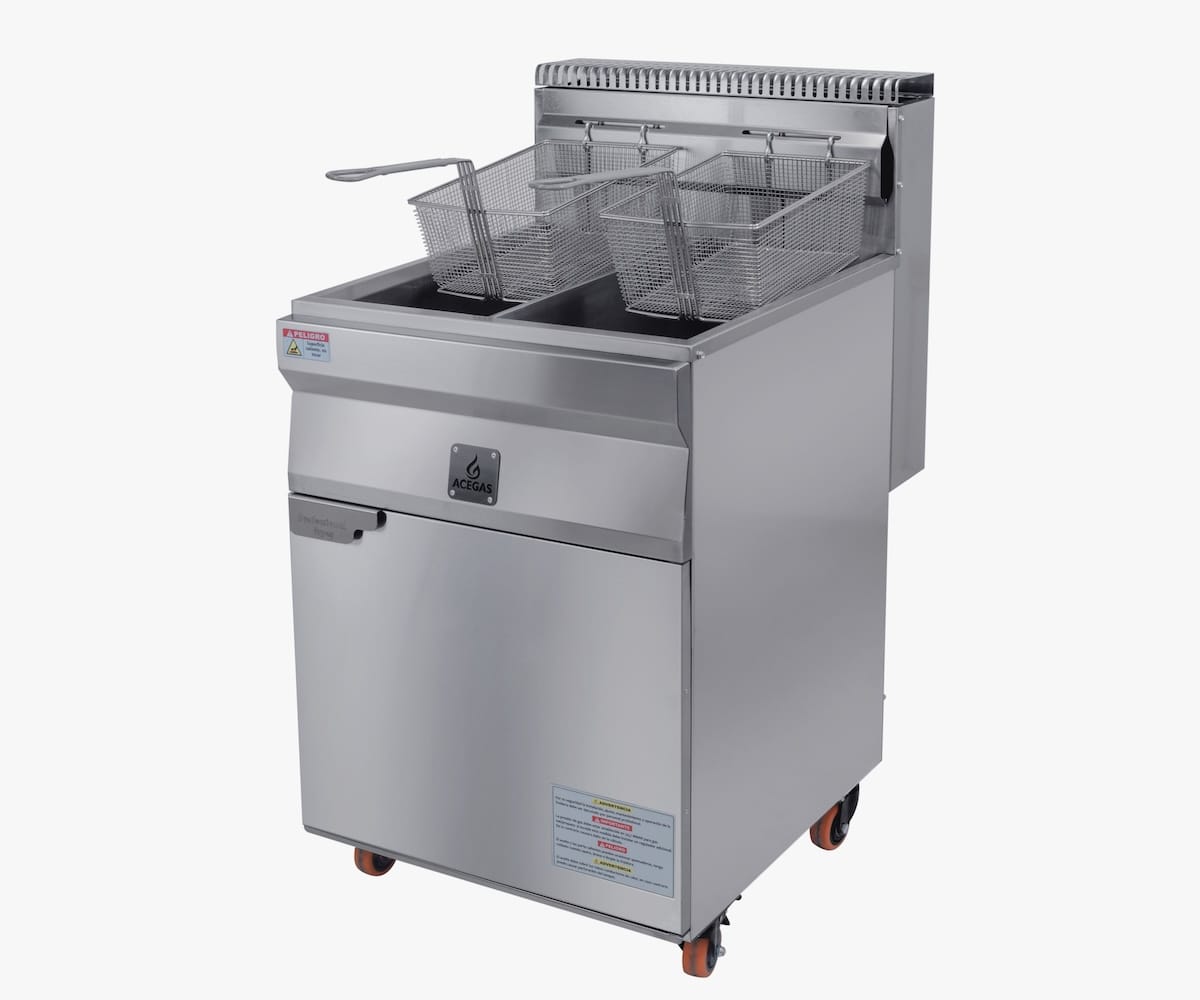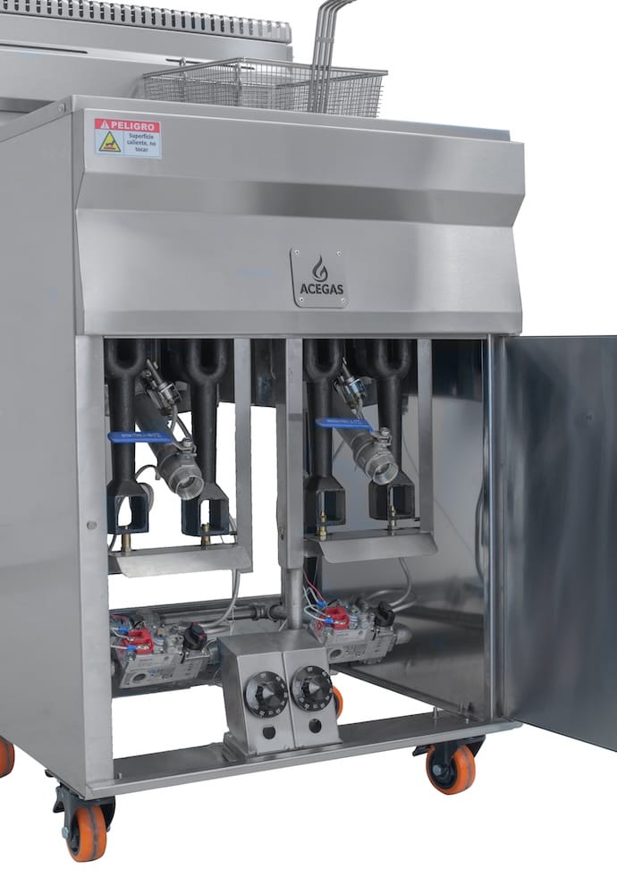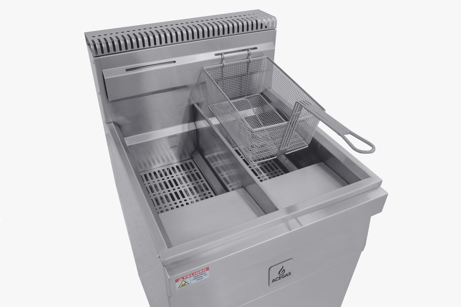 La freidora industrial doble FD18 de Acegas cuenta con dos tanques de 18 litros cada uno, lo que permite freír diferentes alimentos de forma simultánea sin mezcla de sabores.