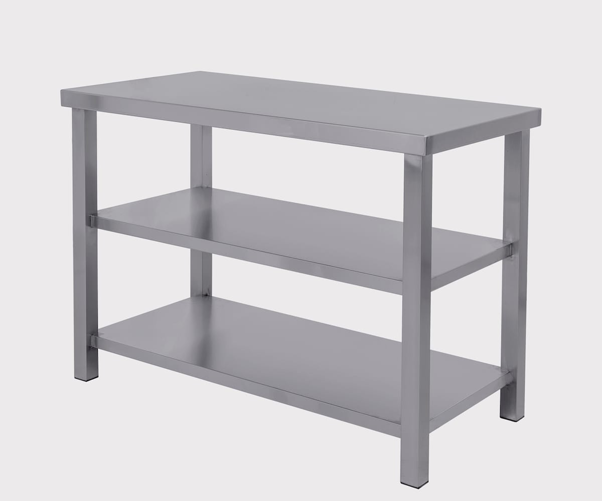 Este mesón de trabajo en acero es la solución perfecta para cocinas profesionales que requieren superficie amplia y doble almacenamiento inferior. Su estructura en acero inoxidable C18/C20 con bordes curvos de seguridad ofrece higiene, resistencia y facilidad de limpieza. Disponible con medidas personalizadas para adaptarse a tu cocina.