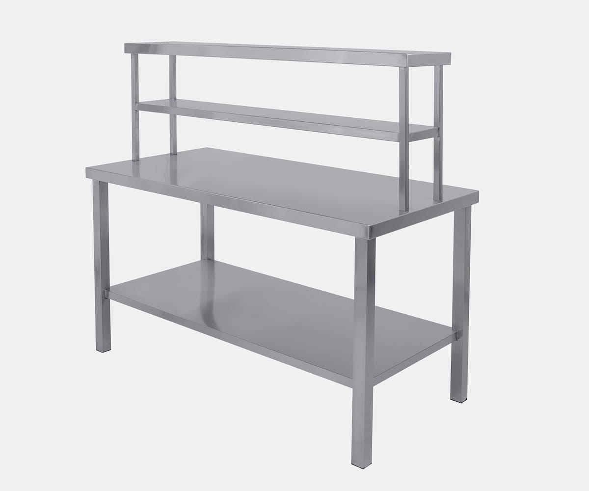 Optimiza al máximo tu espacio de trabajo con este mesón multifuncional en acero inoxidable, que combina superficie de trabajo, entrepaño inferior y estantería superior. Fabricado en acero inoxidable C18/C20, es ideal para organizar utensilios y equipos sin sacrificar higiene ni resistencia. Se fabrica a medida según requerimientos.