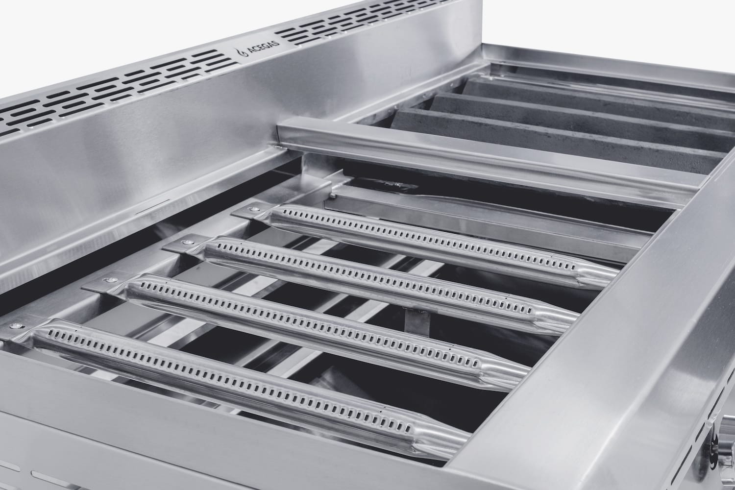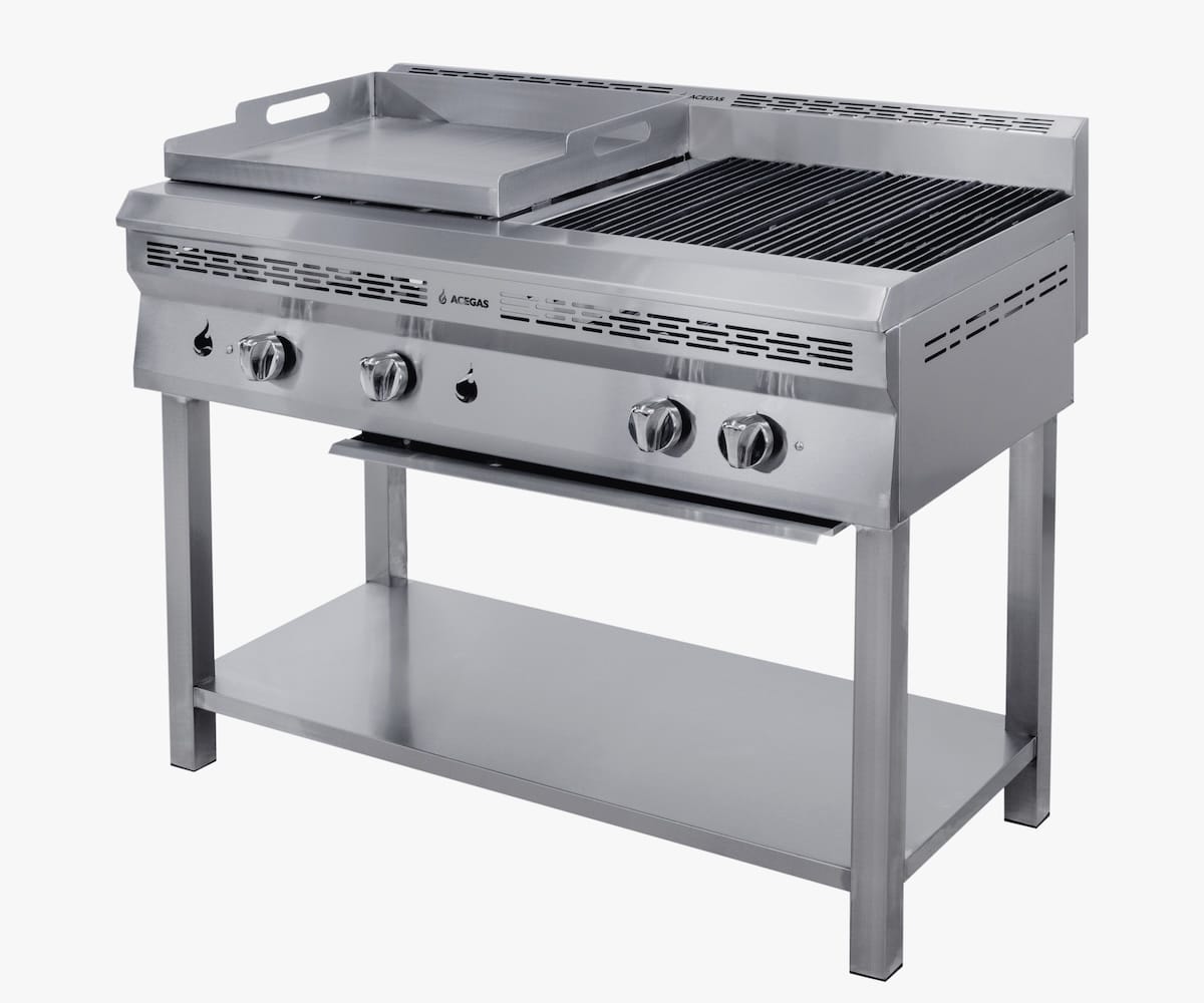 Esta combinación de plancha y parrilla industrial en una sola unidad de 120 cm es la solución perfecta. Con 6 quemadores difusores de hierro fundido y una potencia total de 160,000 BTU/h, permite saltear, dorar y asar al mismo tiempo con control de calor efectivo.