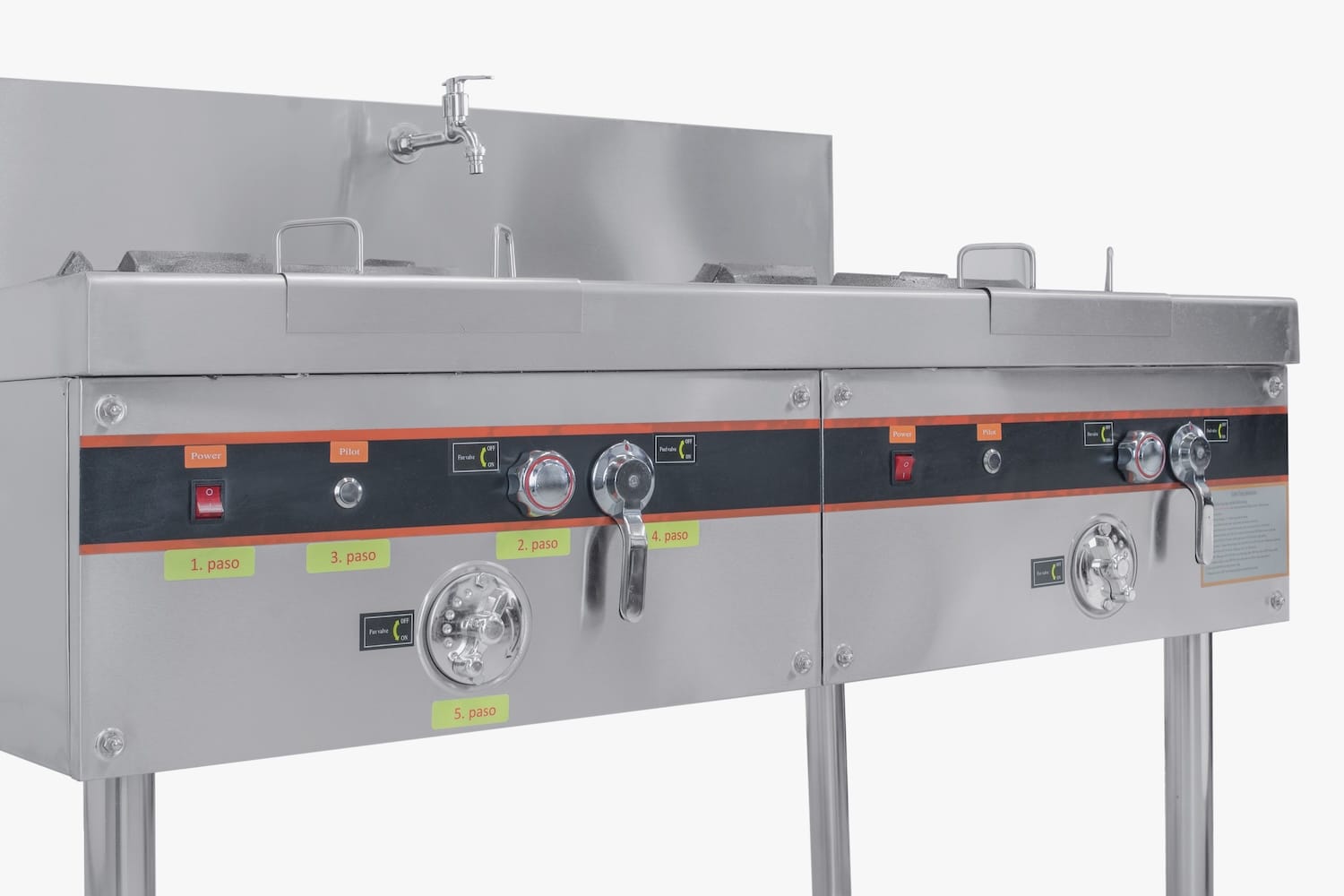 Funciona con gas natural o propano, y está pensado para cocinas profesionales que valoran eficiencia, espacio y rendimiento continuo. Ideal para restaurantes con alta rotación de platos salteados o frituras rápidas.